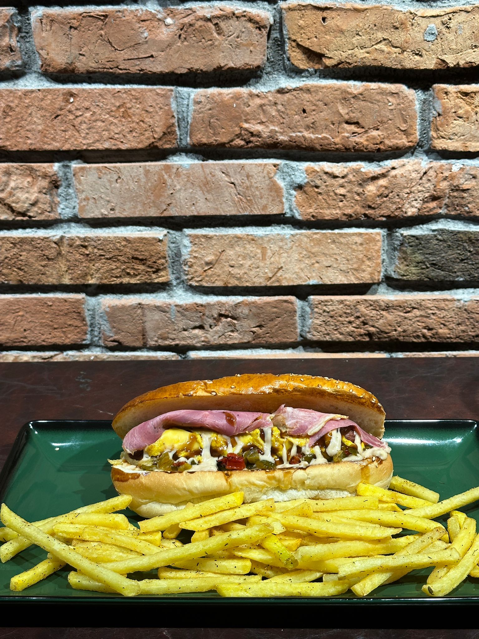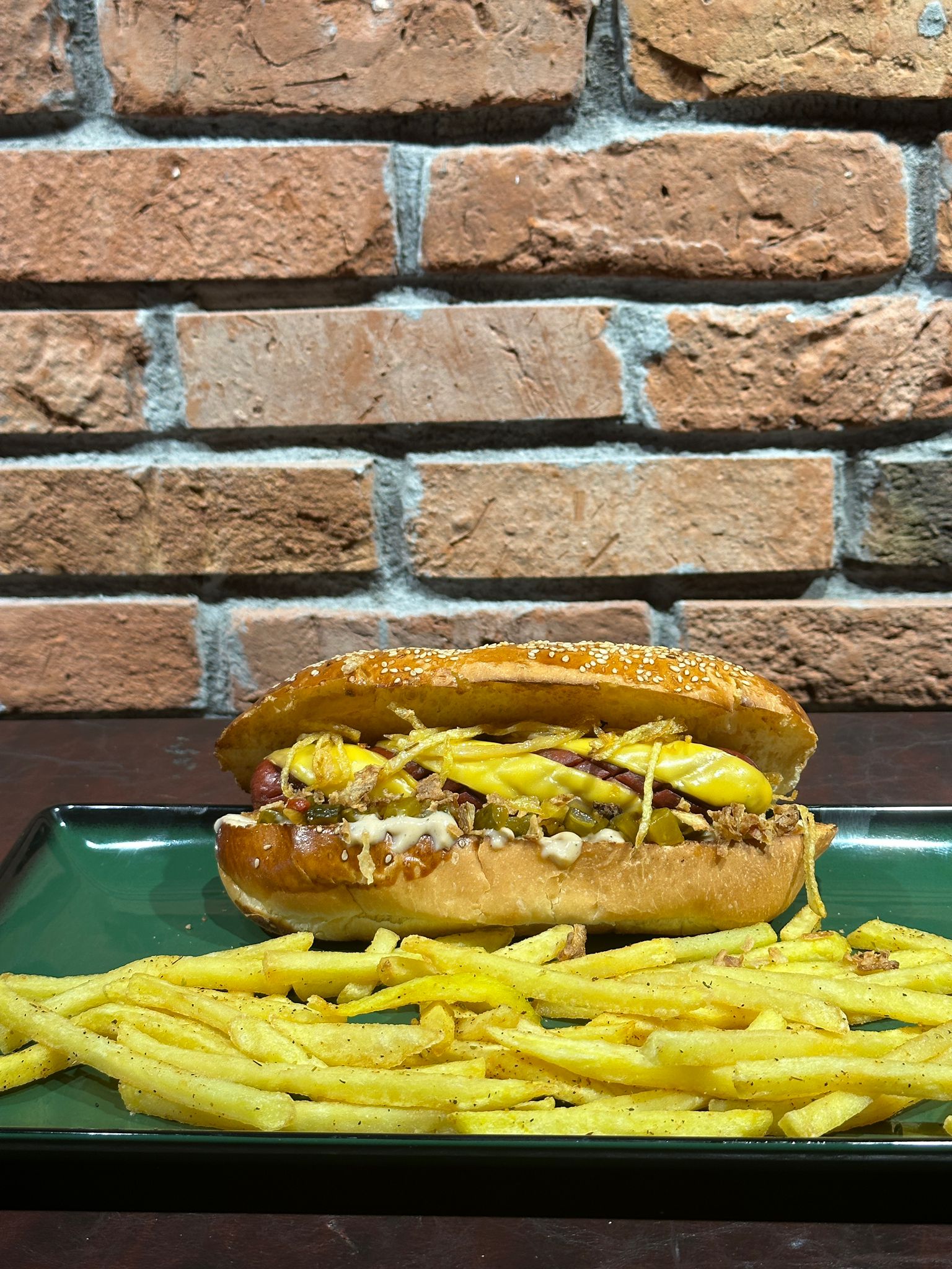 Dana Sosis, Özel Sos, Dana Füme, Cheddar Peyniri, Kırmızı köz biber ve salatalık turşu sote, Kıtır Soğan, Patates Kızartması